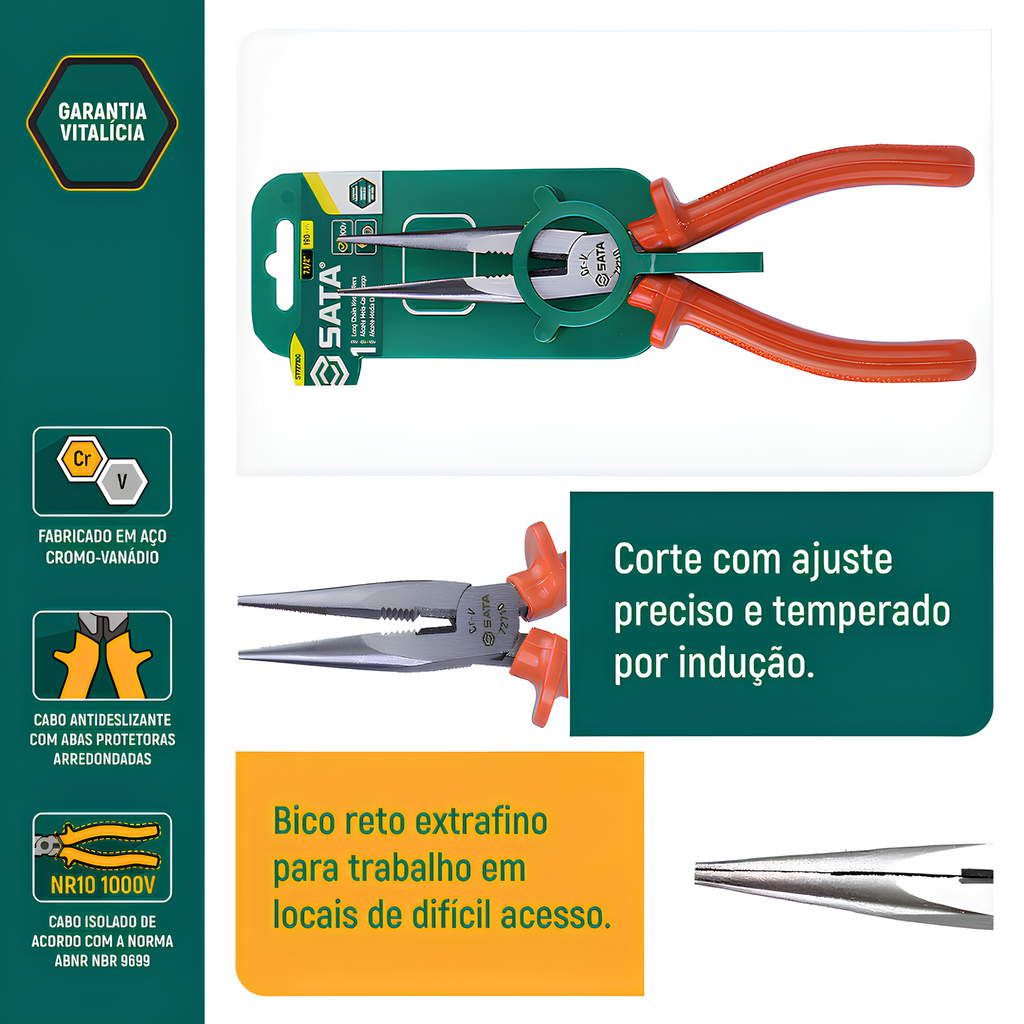 O Alicate Meia-Cana Longo 7.1/2" SATA - ST72710G cumpre rigorosamente a norma DIN ISO 5745 / NR 10 e seu cabo isolado a norma ABNT NBR 9699, garantindo eficiência e segurança ao usuário.