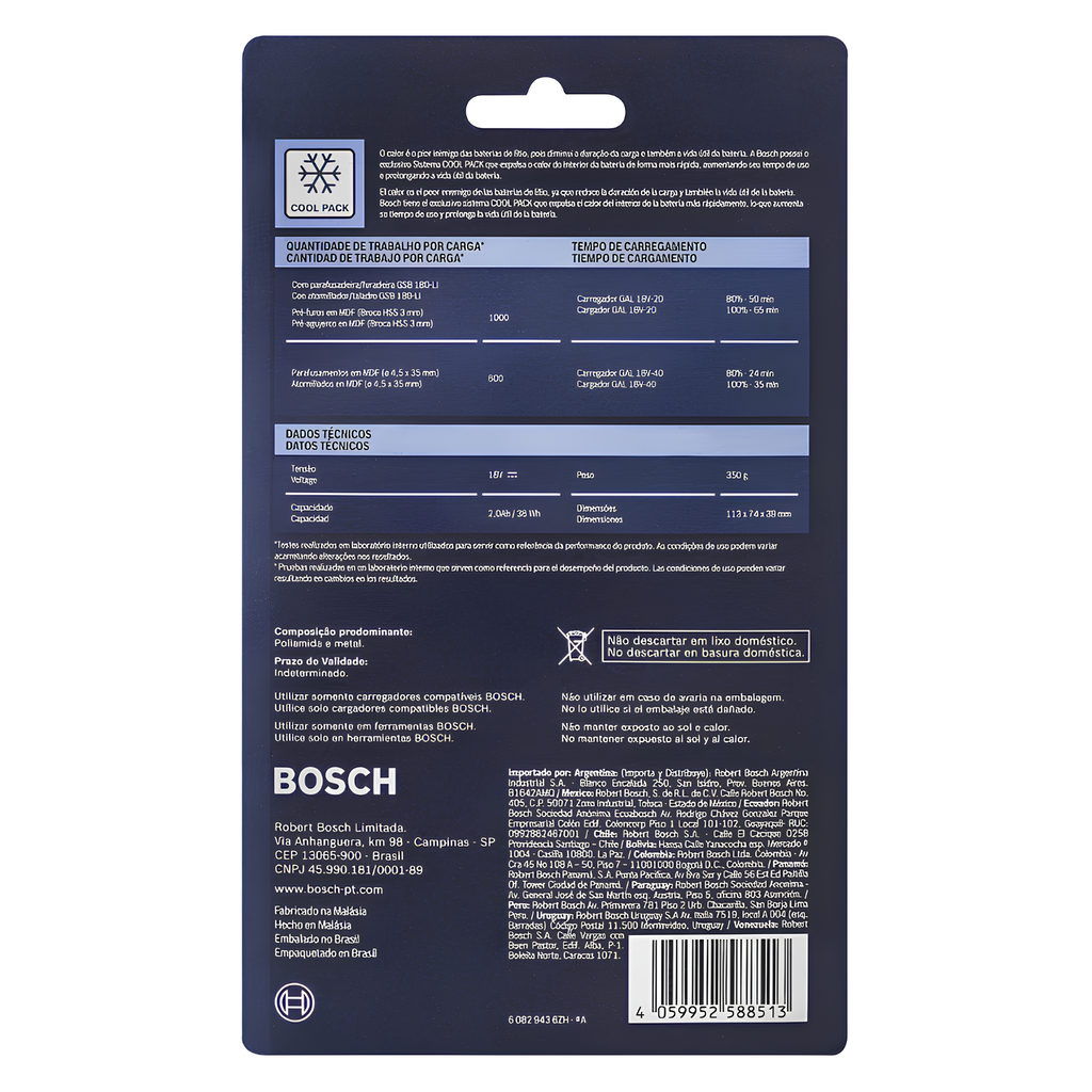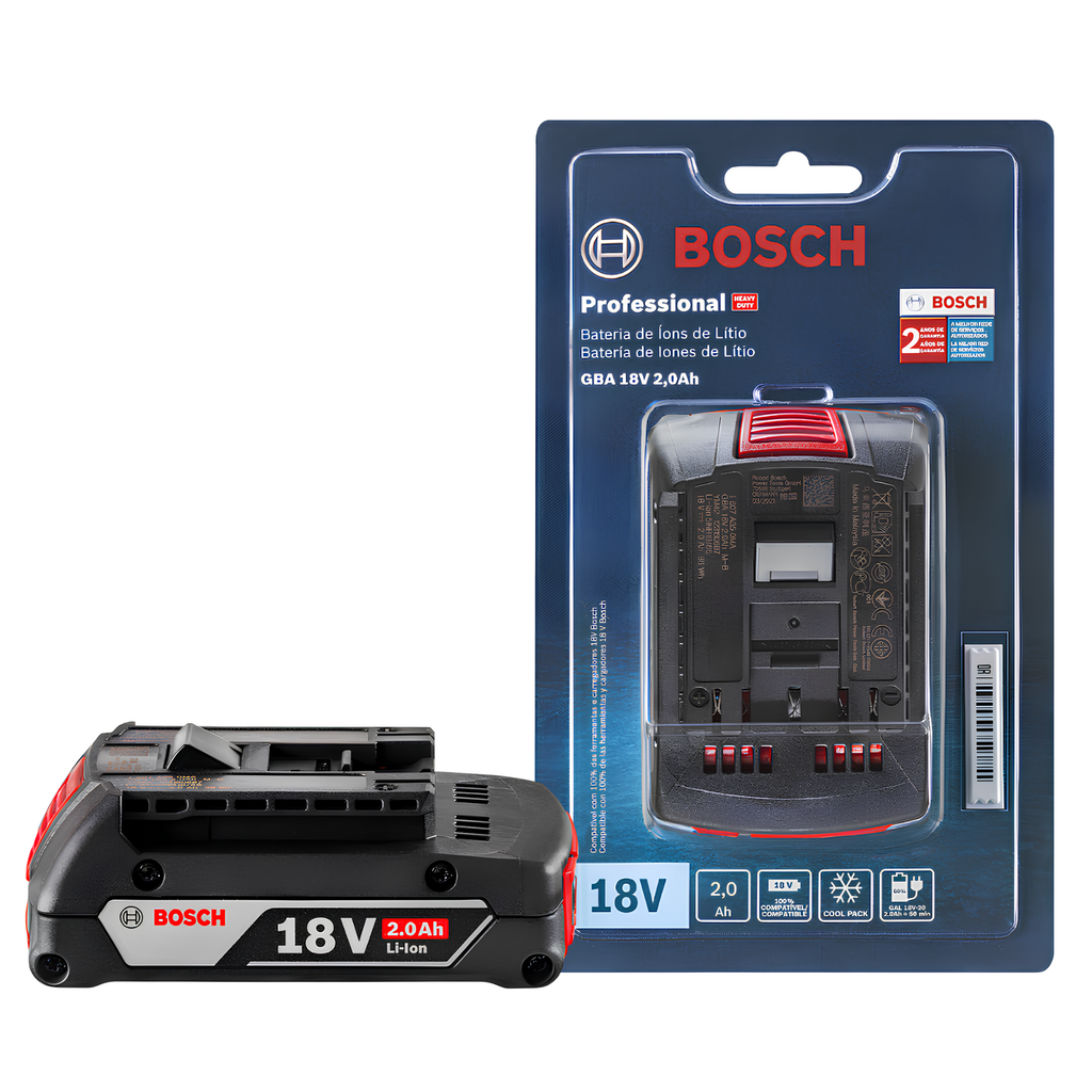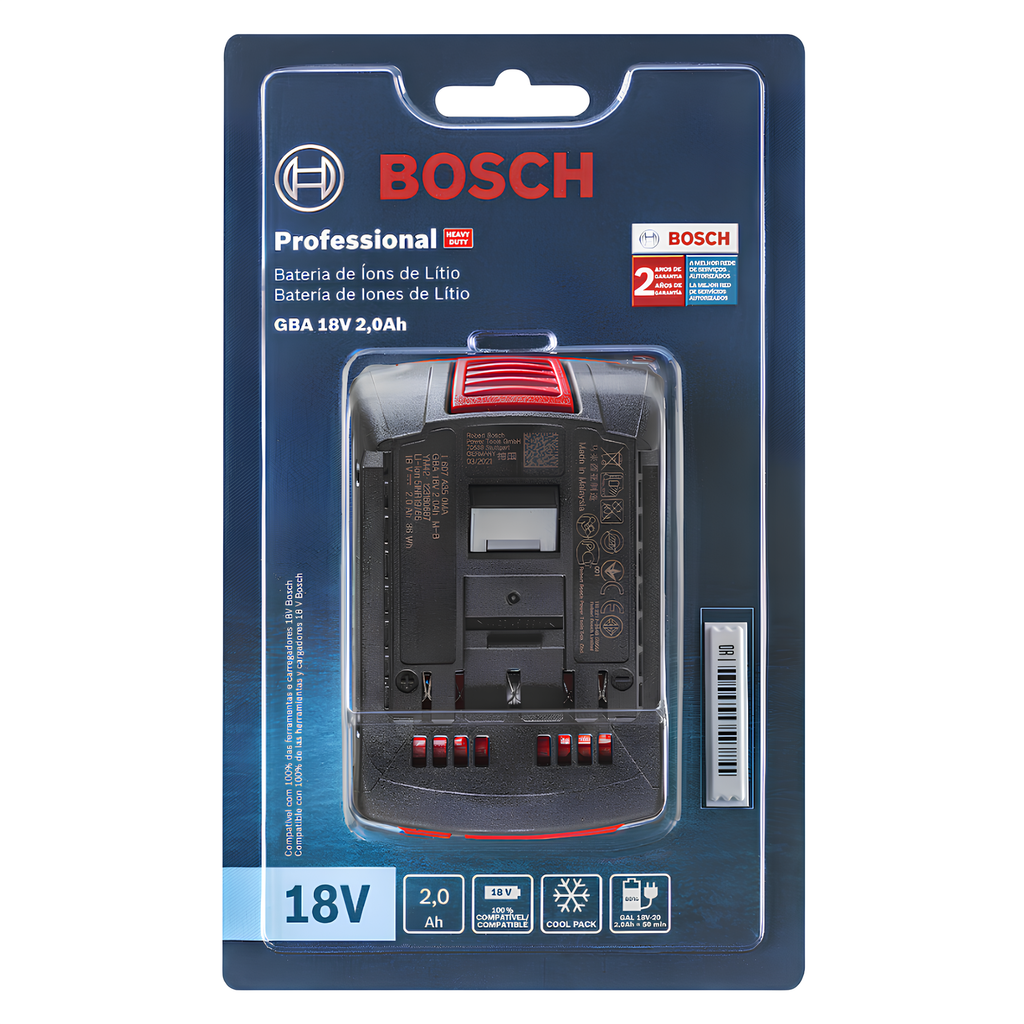 A bateria Bosch 18V possui capacidade de 2,0Ah. Suas células de Íons de Lítio que não possuem efeito memória e não descarregam em repouso. A bateria Bosch 18V GBA 18V tem um exclusivo sistema de controle de temperatura Coolpack que mantém o interior da bateria refrigerado, aumentando o tempo de utilização e sua vida útil. Sua carcaça é fabricada em materiais flexíveis que absorvem o impacto em caso de queda. Compatível com 100% das Ferramentas 18V Bosch.