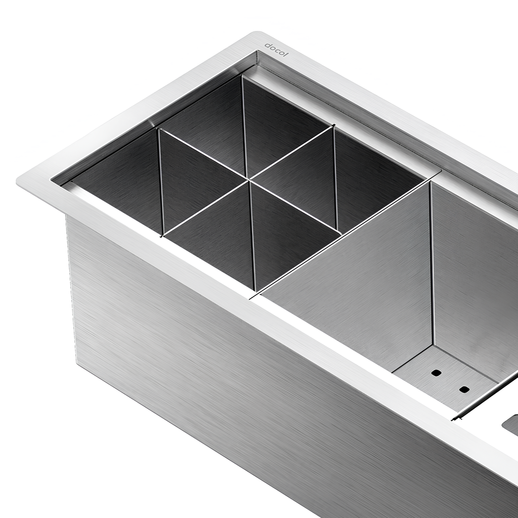 O canal equipado DocolFit é ideal para a composição dos mais variados projetos de cozinhas. Disponível em três opções de comprimento e com uma variedade de acessórios (escorredores auxiliares rasos e profundos, para copos ou alimentos, além de escorredores específicos para pratos e talheres), o canal equipado pode ser instalado por cima ou por baixo da bancada e combina perfeitamente com vários modelos de cubas Docol Inox. Produzidas em aço inoxidável 304, com acabamento escovado, as calhas são totalmente retas e possuem manta antirruído, atributo muito relevante em cozinhas do tipo open space.