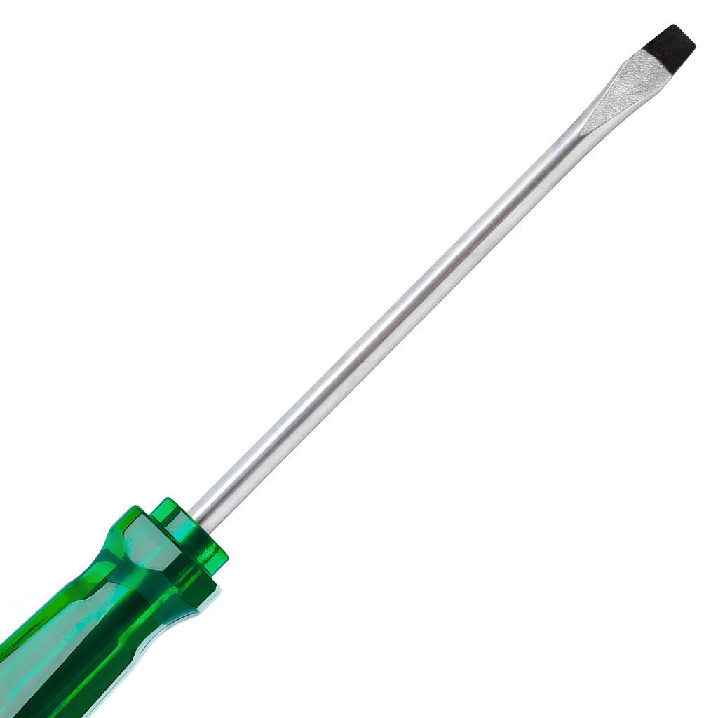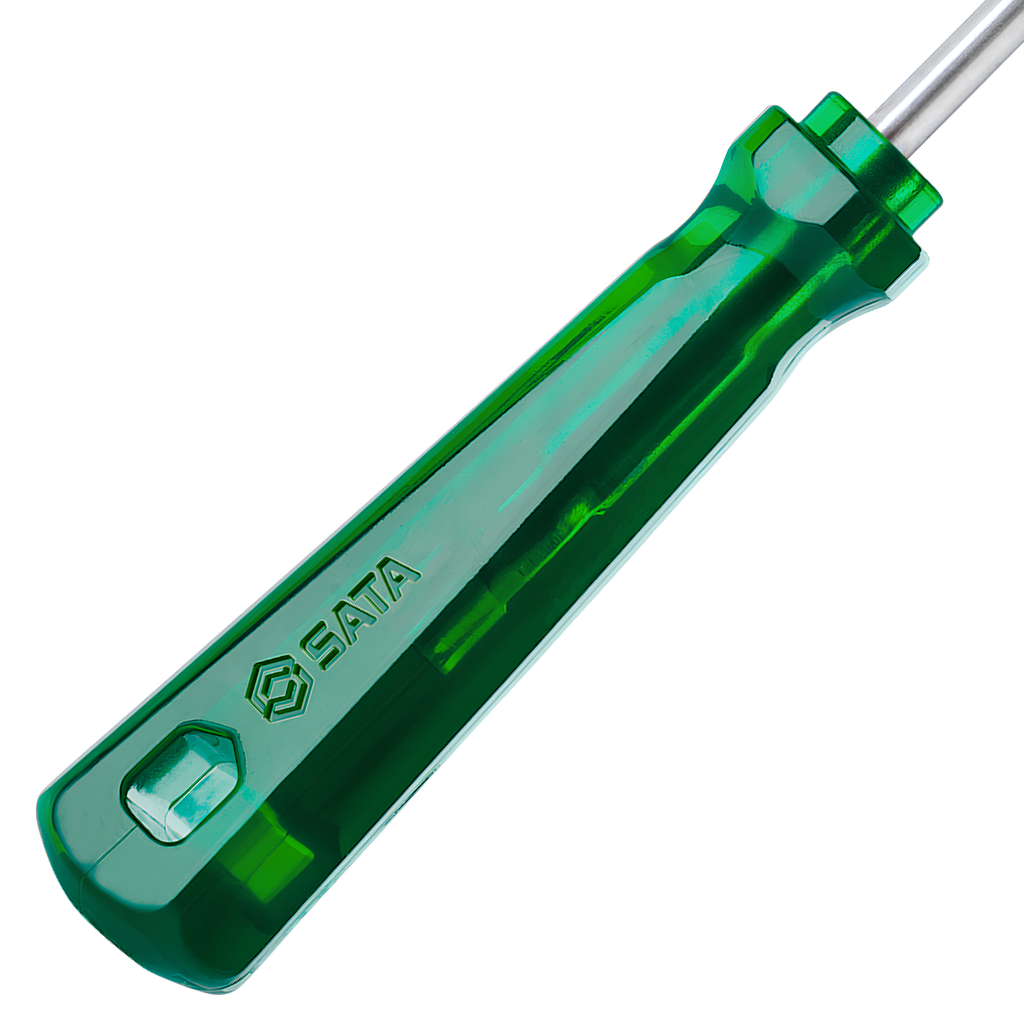 Chave De Fenda com cabo PVC translucido verde ergonômico 5/16X10” SATA com ponta oxidada para evitar descascamento e proporcionar mais segurança. Possui a haste toda temperada com acabamento niquelado e cromado.