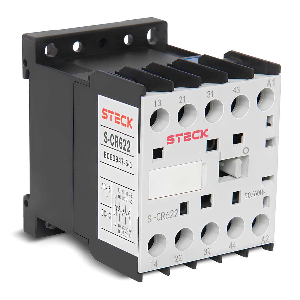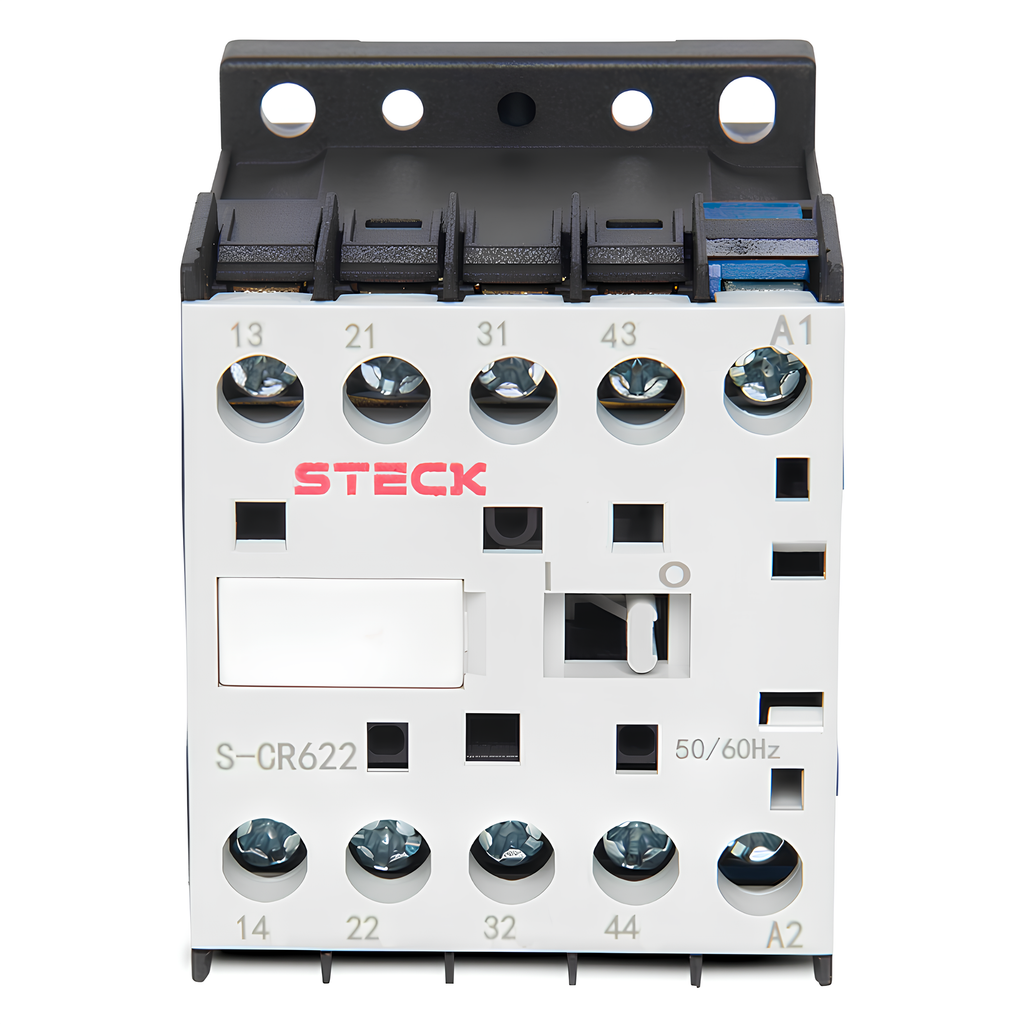 Contator auxiliar SCR622B da Steck, com alimentação em 24V (AC), frequência de 50/60Hz. Possui 2 contatos normalmente abertos (NA) e 2 contatos normalmente fechados (NF), ideal para comandos e sinalizações em sistemas elétricos e automação industrial. Compacto, confiável e de fácil instalação, oferece alto desempenho em manobras auxiliares de circuitos elétricos. Indicado para uso em painéis de controle e sistemas de intertravamento.