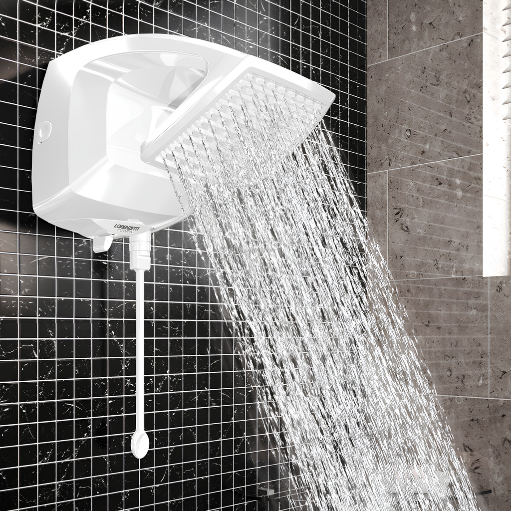 Ducha de Parede (sem a necessidade de cano para instalação) com design inovador, seguindo a tendência de linhas quadradas.