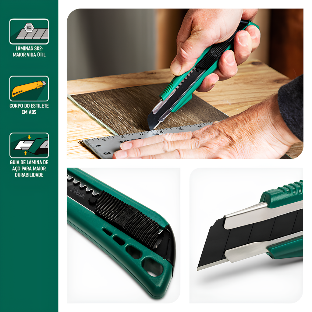 - Afiamento Constante e Segurança: Sempre que um segmento é utilizado, você pode quebrar a ponta para ter uma lâmina nova e afiada, garantindo cortes precisos e eficientes.