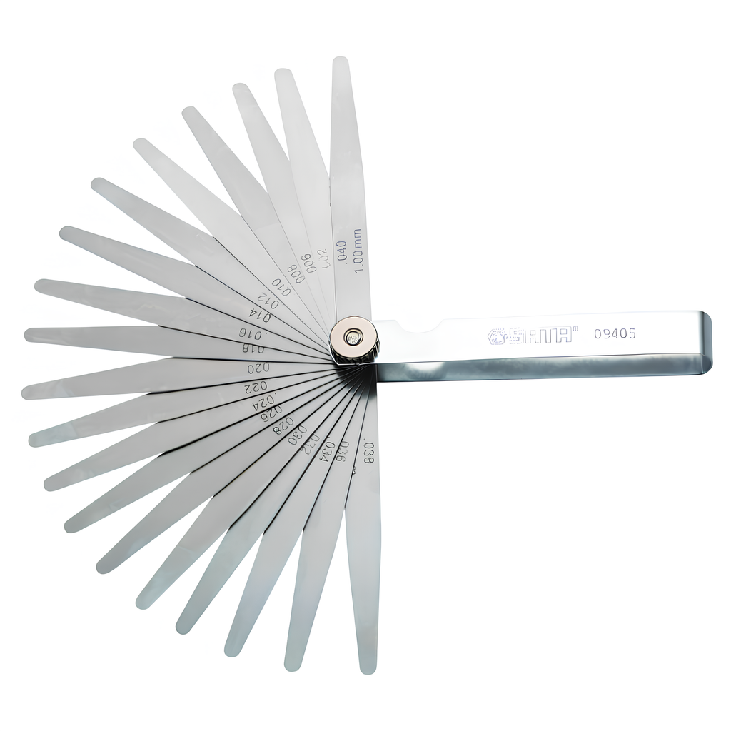 Composição: 23 Lâminas Removíveis Nas Espessuras: 0,02, 0,03, 0,04, 0,05, 0,10, 0,15, 0,20, 0,25, 0,30, 0,35, 0,40, 0,45, 0,50, 0,55, 0,60, 0,65, 0,70, 0,75, 0,80,0,85, 0,90, 0,95, 1,00 mm