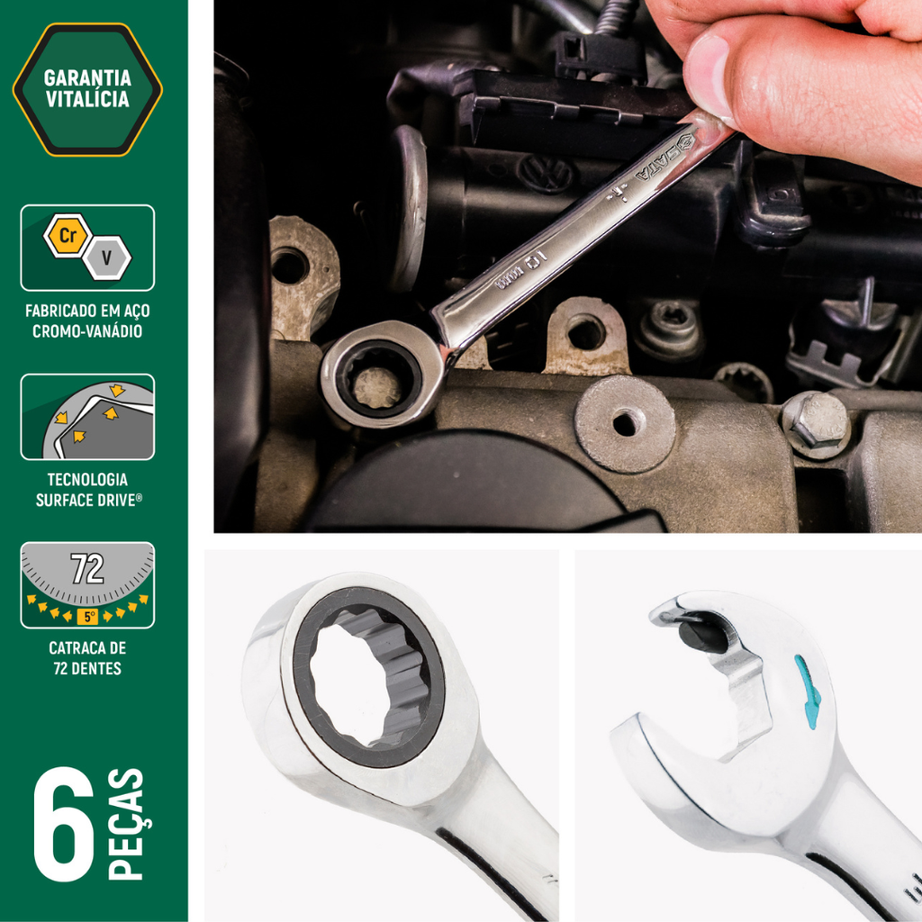 Sua catraca possui 72 dentes, proporcionando maior agilidade e ergonomia pois necessita de apenas 5º para apertar ou desapertar parafusos e porcas, sendo mais eficiente que as chaves convencionais que demandam um ângulo de 30º.