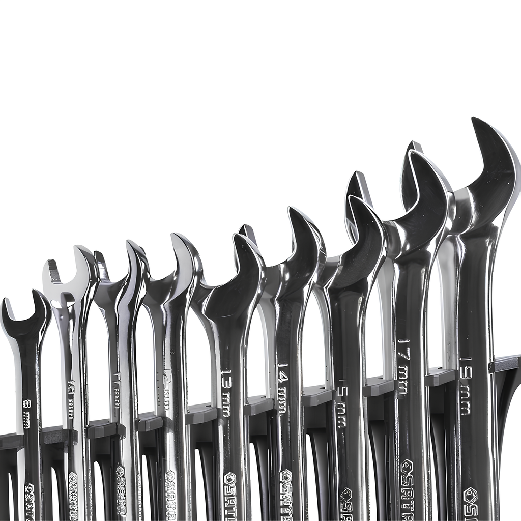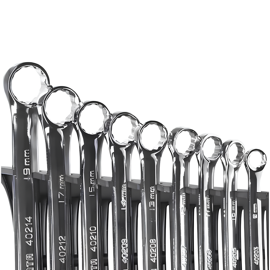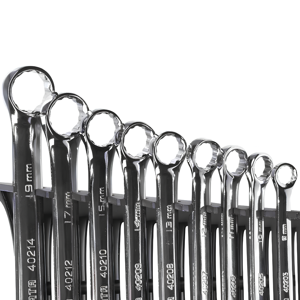 Composto por 9 chaves em mm: 8, 10, 11, 12, 13, 14, 15, 17, 19mm
