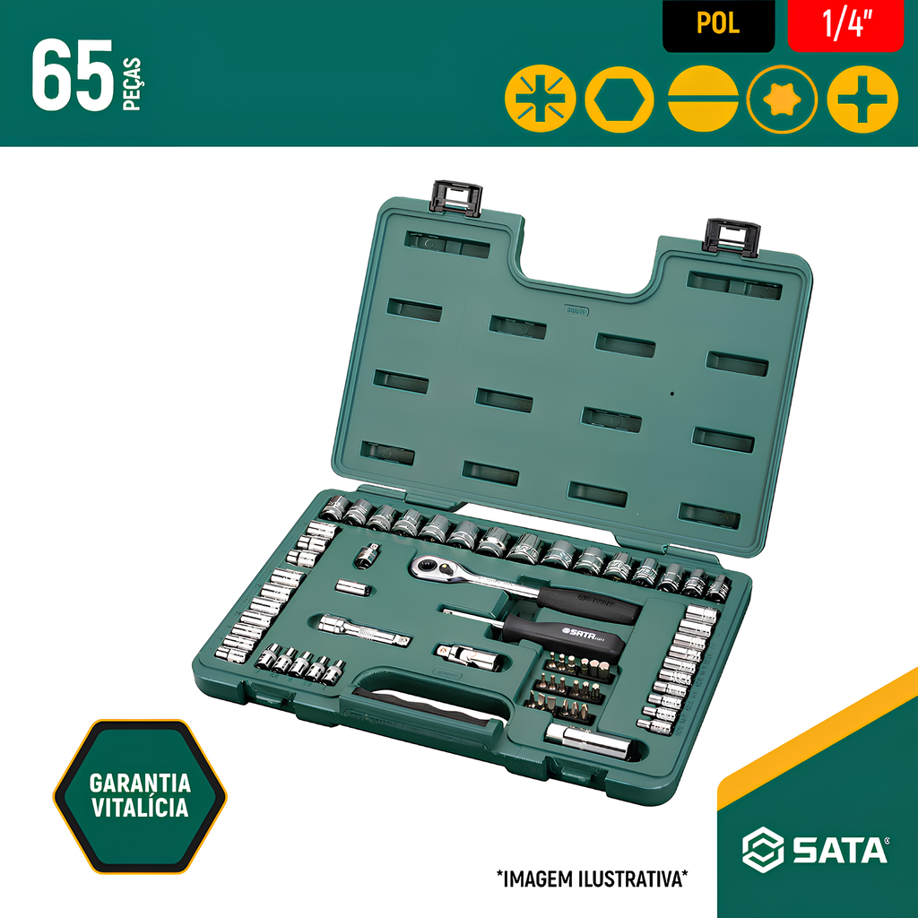 Composição: O jogo de Soquete Sextavado e Bit 1/4" e 3/8" 65 peças SATA acompanha: