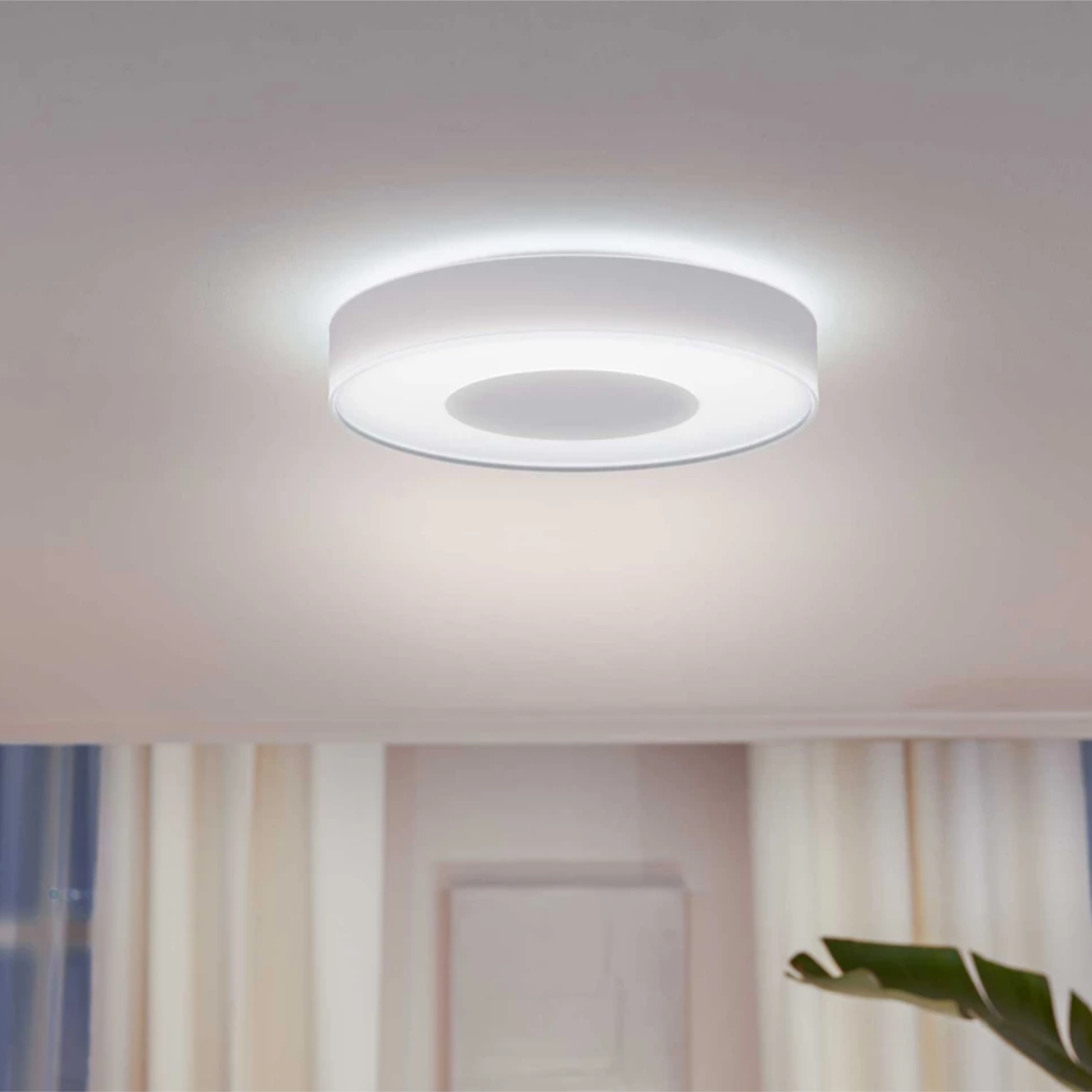 A luminária de teto Philips Hue Infuse White and Color Ambiance é uma solução de iluminação inteligente que combina tecnologia avançada e design moderno para transformar ambientes internos. Com LED integrado de 33,5 W e tecnologia White and Color Ambiance, permite ajustar a temperatura de cor entre 2000 K e 6500 K e selecionar milhões de cores via aplicativo Philips Hue ou comando de voz, proporcionando iluminação personalizada para diferentes momentos do dia. Ideal para salas de estar, quartos, escritórios ou qualquer ambiente interno residencial ou corporativo, a luminária é compatível com controle Bluetooth para uso local e com Hue Bridge para automação completa de iluminação inteligente. Ela oferece iluminação forte, eficiente e versátil, adaptando-se a necessidades de relaxamento, foco ou ambientação de festas.