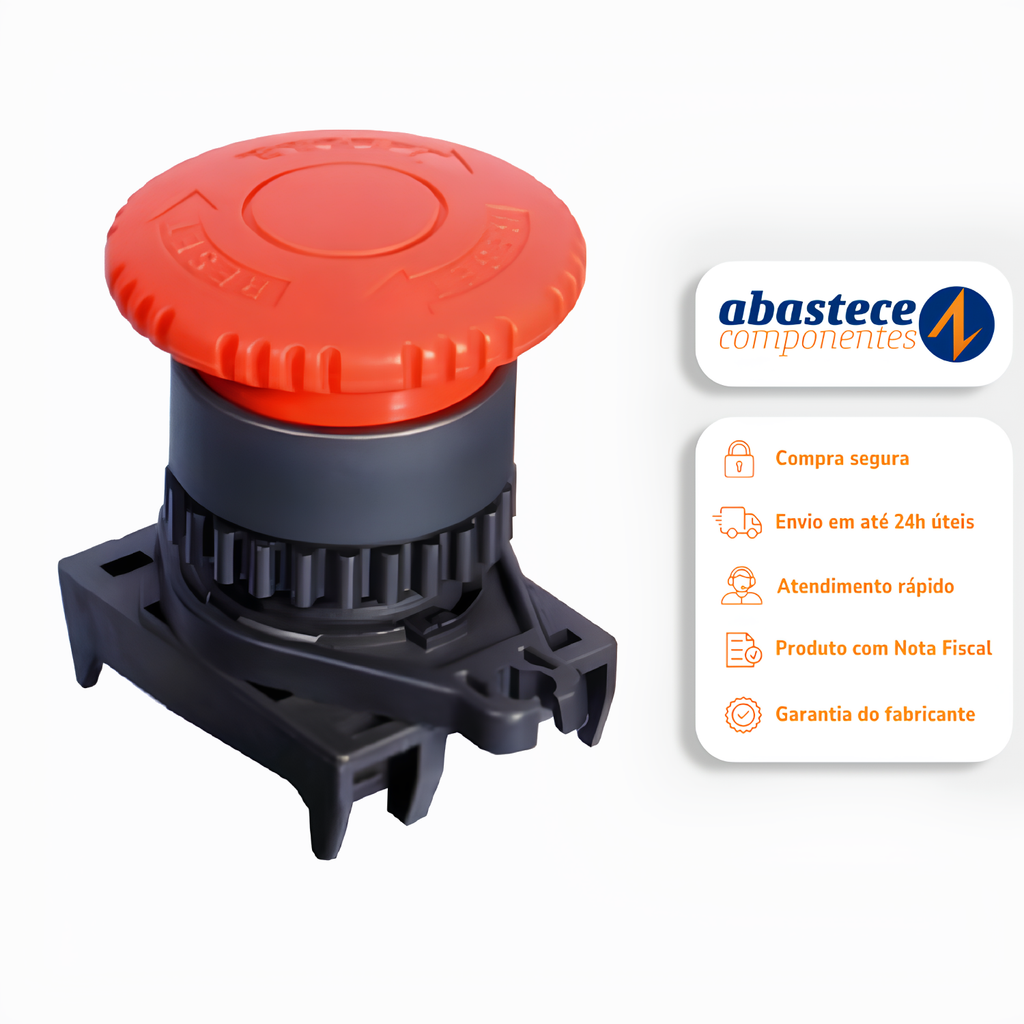 Tipo de operação : Empurrar- trava, virar-destrava Tipo de botão : D40 (cabeça curta, não iluminada) Cor : Vermelho Número de contato 1 Power Suppy 110 VAC / 10A 220 VAC / 5 A